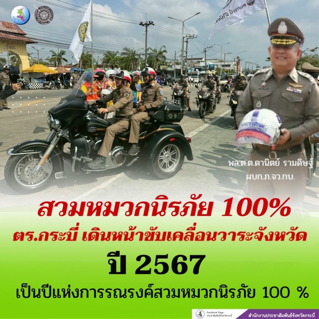 อุบัติเหตุทางถนน เป็นปัญหาสำคัญของหลายประเทศทั่วโลก รวมทั้งประเทศไทยและพื้นที่จังหวัดกระบี่ ซึ่งยานพาหนะที่เกิดเหตุและเสียชีวิตสูงสุดคือ รถจักรยานยนต์ และพฤติกรรมเสี่ยงสำคัญคือ การขับรถเร็ว และการไม่สวมหมวกนิรภัย ผู้ว่าราชการจังหวัดกระบี่ จึงได้ออกประกาศจังหวัดกระบี่ กำหนดให้ปี พ.ศ. 2567 เป็นปีแห่งการรณรงค์สวมหมวกนิรภัย 100 เปอร์เซ็นต์ กองบังคับการตำรวจภูธรจังหวัดกระบี่ ได้ดำเนินการมาตรการด้านการบังคับใช้กฏหมายจราจรอย่างเคร่งครัด ควบคู่การรณรงค์ประชาสัมพันธ์เชิงรุก จึงบูรณาการร่วมกับศูนย์อำนวยการความปลอดภัยทางถนนจังหวัดกระบี่ และภาคีเครือข่ายการป้องกันและลดอุบัติเหตุทางถนนจังหวัดกระบี่ ดำเนินการโครงการรณรงค์ สวมหมวกนิรภัย 100 เปอร์เซ็นต์ เพื่อประชาสัมพันธ์สร้างการรับรู้แก่ประชาชนและนักท่องเที่ยว ให้มีความตระหนักรู้ในการสวมหมวกนิรภัย 100 เปอร์เซ็นต์ ทั้งคนขับและคนซ้อน เพื่อให้มีความปลอดภัยในชีวิตและทรัพย์สิน ลดอัตราการเจ็บ ลดอัตราการตายจากอุบัติเหตุทางถนนในพื้นที่จังหวัดกระบี่ ต่อไป