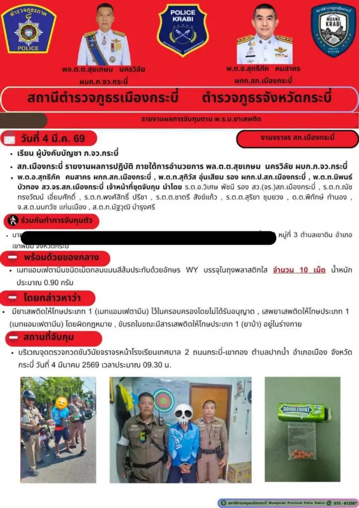 งานจราจร สภ.เมืองกระบี่ จับกุมผู้ต้องหา1ราย พร้อมของกลางเมทแอมเฟตามีนชนิดเม็ดกลมแบนสีส้มประทับด้วยอักษร WY บรรจุในถุงพลาสติกใส จำนวน 10 เม็ด