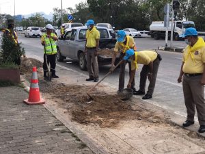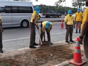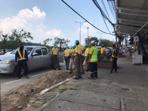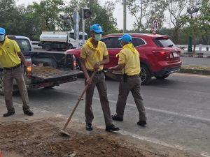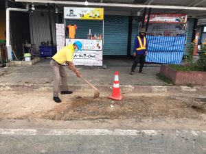 4.การปฏิบัติ > ร่วมกันปรับปรุงพื้นผิวถนนที่มีกองดินตามจุดต่างๆ ตามจุดที่มีการปรับปรุงถนนเเละการวางท่อ โดยการปรับพื้นผิวให้มีความราบเรียบ ซึ่งอาจเป็นจุดเสี่ยงที่ทำให้เกิดอุบัติเหตุจราจร